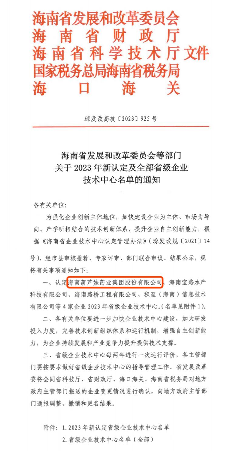 近日,海南省发改委等多部门联合公布了《关于2023年新认定及全部省级企业技术中心名单的通知》,其中,海南40001百老汇药业集团股份有限公司成功通过评审,被认定为省级企业技术中心,是本次获批的4家企业之一。